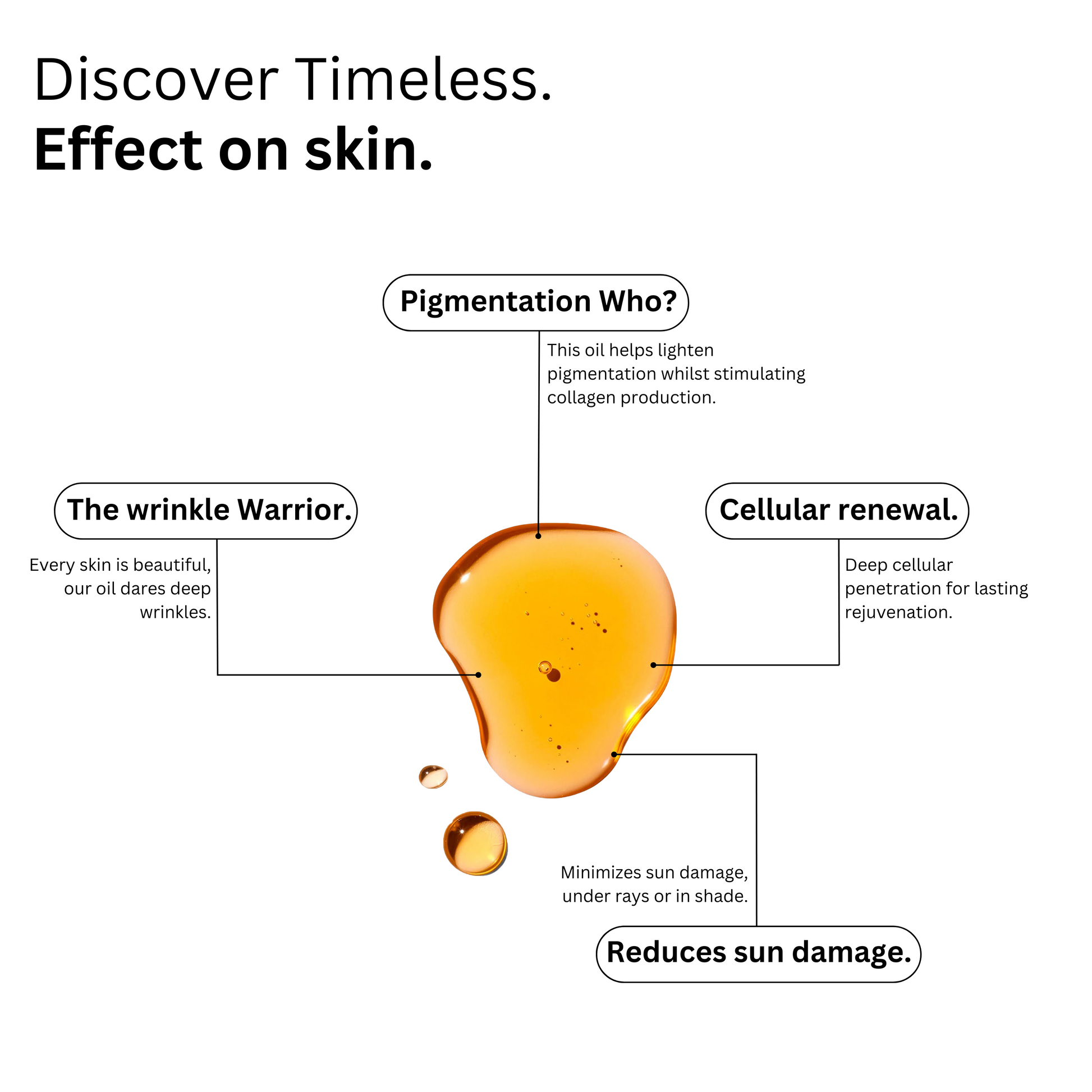 Timeless Oil works by boosting collagen levels, which are essential for skin strength, structure, and elasticity. Packed with nourishing ingredients, it helps restore vitality, smooth fine lines, and promote a healthy, radiant complexion.