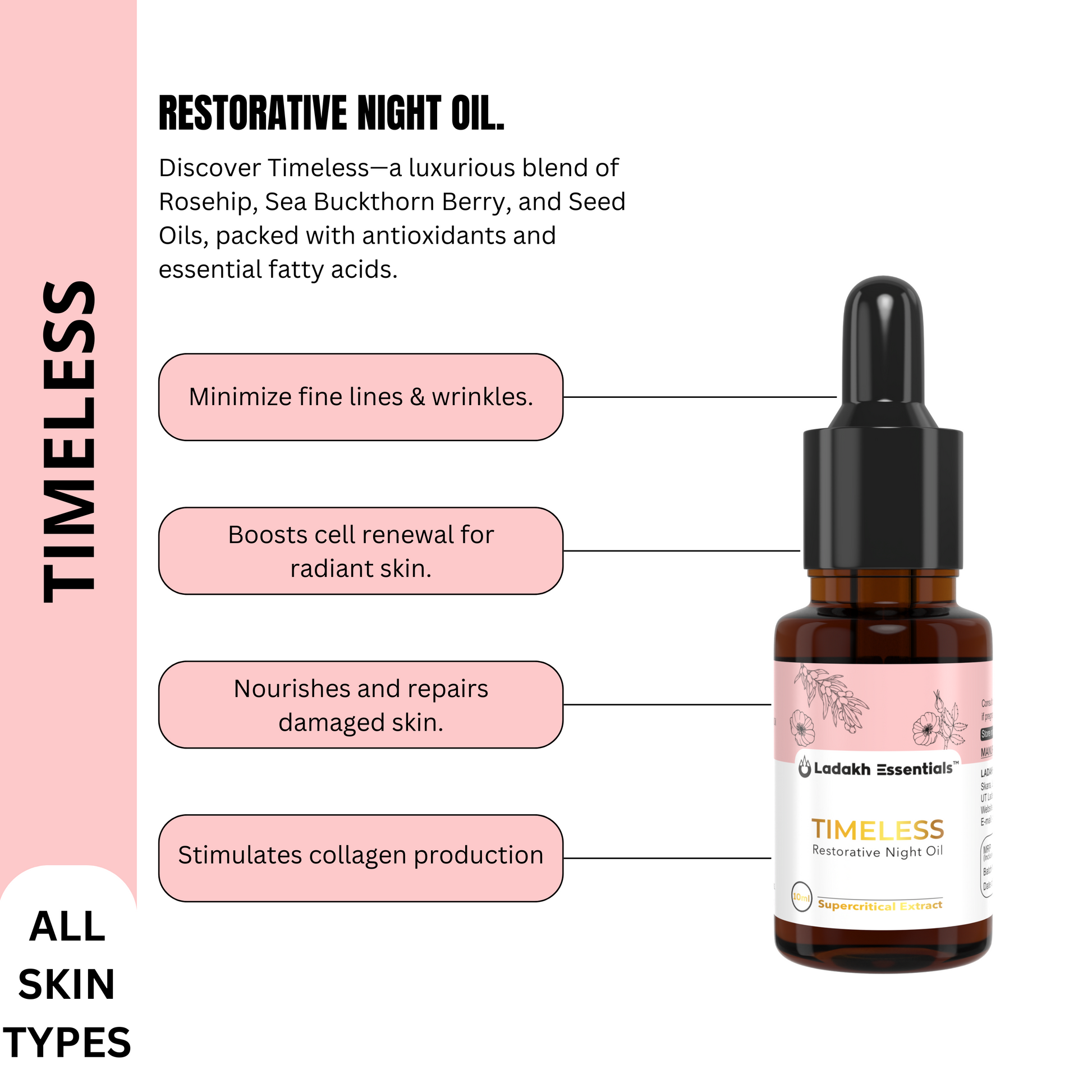 10ml IRegular price Rs. 900Regular priceUnit price / perSale price Rs. 900Discover Timeless—a luxurious blend of Rosehip, Sea Buckthorn Berry, and Seed Oils, packed with antioxidants and essential fatty acids. This nourishing oil hydrates, repairs, and brightens, revealing smoother, youthful skin with a radiant glow. Perfect for all skin types, it helps reduce signs of aging and restore vitality with every drop.