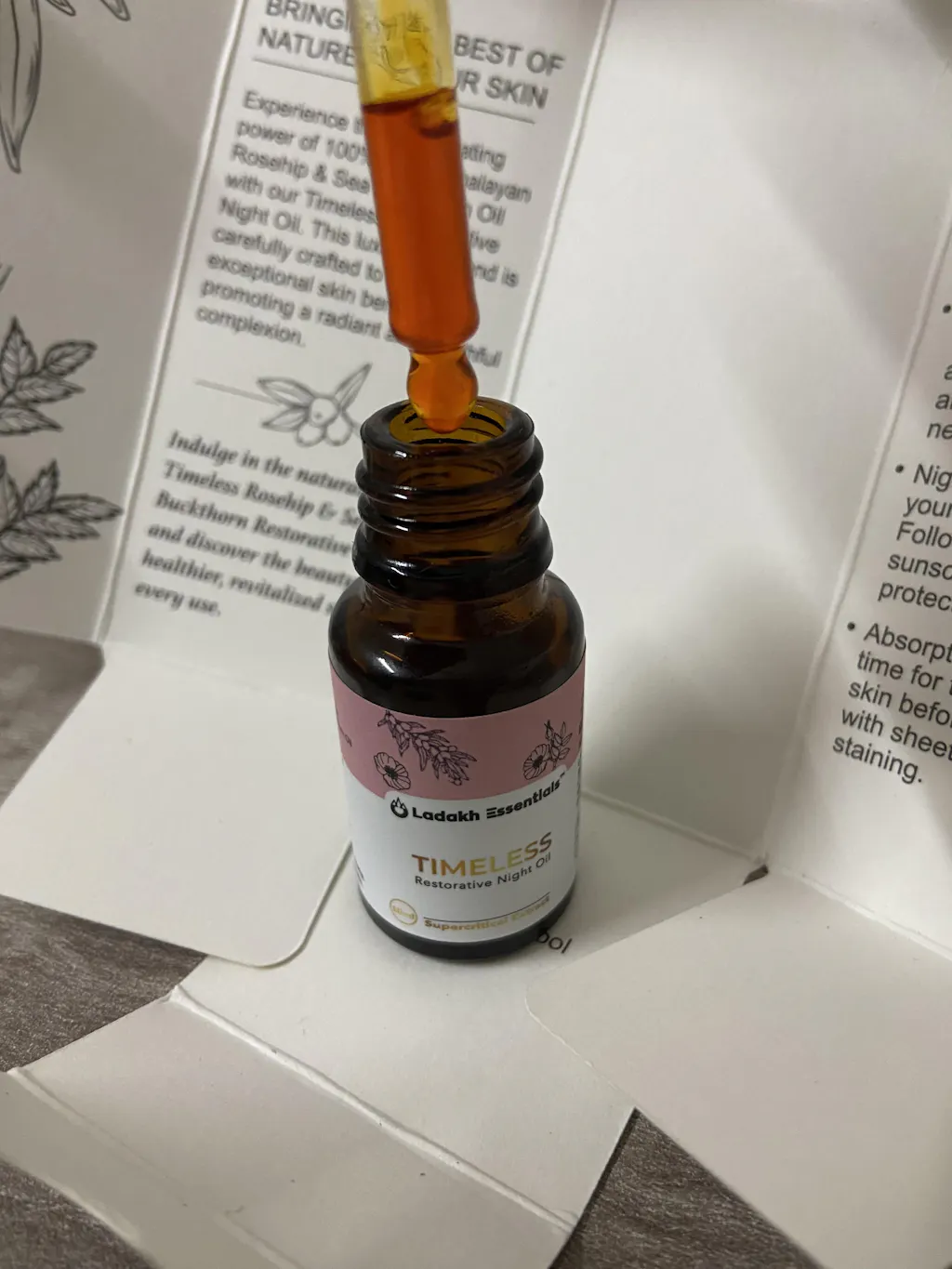 I had been using their Seabuckthorn Berry Oil for a long time, so when I came across the TIMELESS Restorative Night Oil, I knew I had to try it. The fact that it’s a blend of pure Himalayan Seabuckthorn Oil and Himalayan Rosehip Oil made it even more tempting.